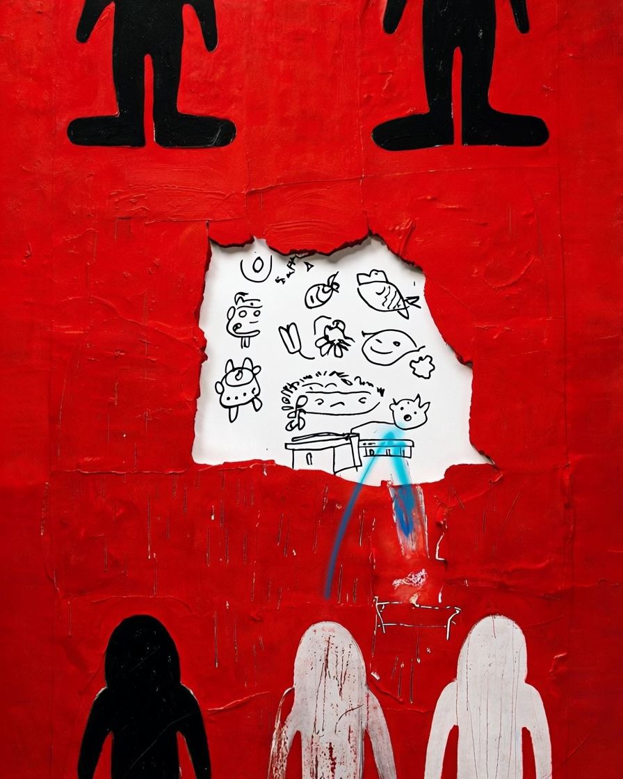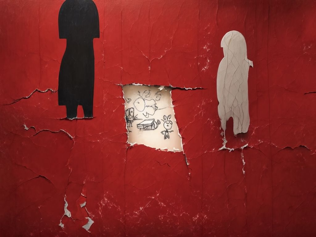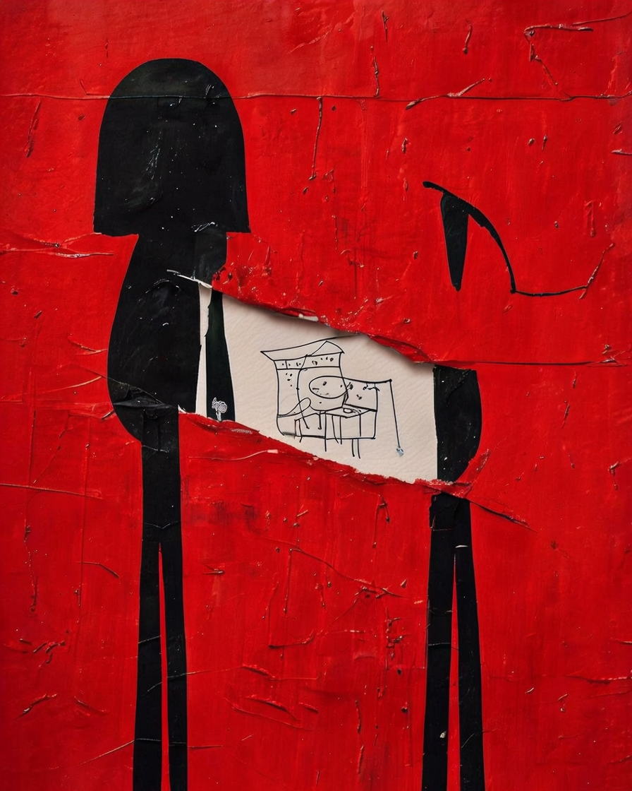 “The Hidden Parade” unfolds on a textured red surface where two opposing silhouettes — one dark, one pale — stand like guardians of a threshold. At the center, a torn opening reveals a childlike drawing: a fish, a rabbit‑like creature, a small figure, and a simple object that could be a table or a box. These characters appear suspended in a quiet, playful world beneath the surface. The contrast between the monumental exterior and the whimsical interior sketch creates a dialogue between concealment and revelation, between the rigid structures of adulthood and the imaginative freedom that persists underneath. This work becomes a window into a hidden parade of innocence and invention.