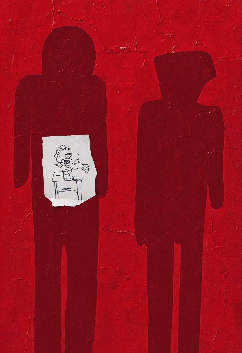 A large red silhouette stands against a textured crimson surface, its form barely emerging from the wall. At the center of the figure, a small opening reveals a childlike drawing: a seated student, a taller figure beside them, and floating symbols that suggest thought, imagination, or instruction. This fragile interior scene contrasts sharply with the monumental exterior, creating a dialogue between authority and vulnerability, memory and presence. The work reflects on the traces of childhood that remain embedded within the adult body.
