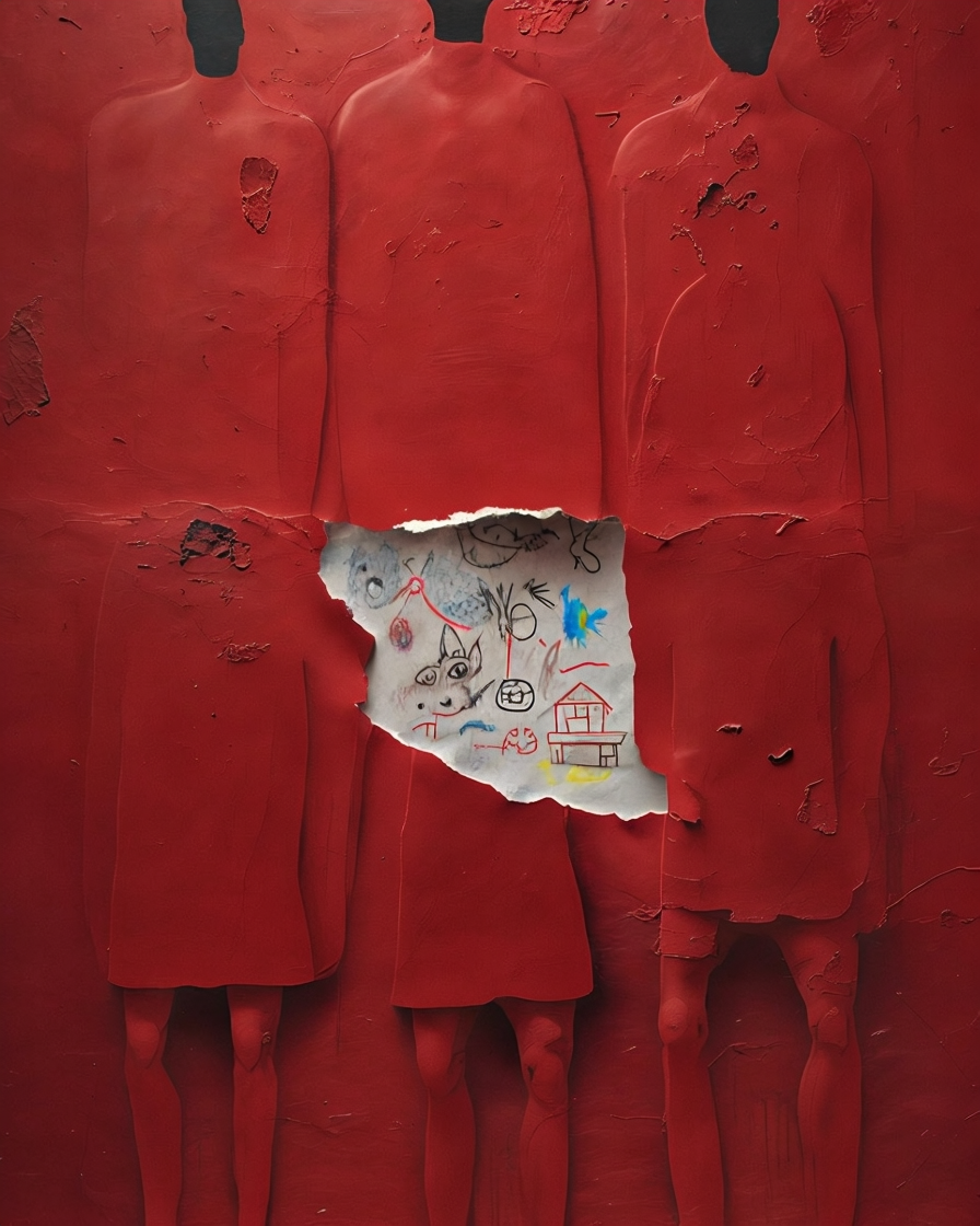 “The Red Wall of Forgotten Stories” unfolds on a textured red surface where four faceless silhouettes stand like silent witnesses. Their presence is monumental yet mute, forming a barrier that seems impenetrable. At the center, a torn opening reveals a vibrant constellation of childlike drawings — a cat, a house, a sun, a car, trees, and abstract marks bursting with color and spontaneity. This inner world contrasts sharply with the rigid exterior, suggesting a narrative of hidden memories, suppressed imagination, or the quiet persistence of an inner life beneath a uniform façade. The work becomes a window into the stories we carry but rarely show.