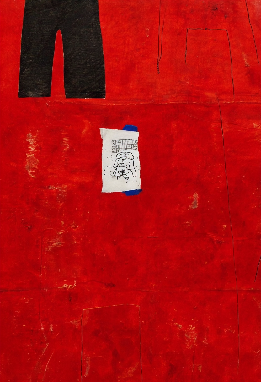 A red figure emerges from a textured crimson surface, its form both monumental and silent. At the center, a torn opening reveals a small childlike drawing: a simple bench, an expressive creature with large ears, and an arrow linking the two. This fragile interior scene contrasts sharply with the weight of the surrounding red body. The work explores the tension between the vast exterior and the intimate narrative hidden beneath, evoking memory, vulnerability, and the quiet persistence of the inner child.