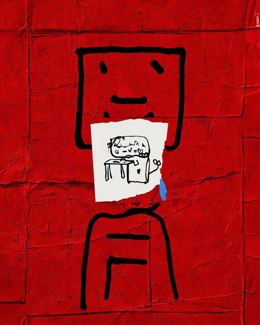 “The Sleeper Inside the Red Figure” unfolds on a textured red surface where a single outlined figure stands in quiet simplicity. Its square head and rigid posture suggest a façade of control, yet the torn opening at the center reveals a tender scene: a small character resting at a desk, eyes closed, surrounded by floating hearts. A blue mark beneath the opening adds a subtle emotional rupture, like a drop of feeling escaping through the surface. The contrast between the stoic exterior and the intimate interior drawing creates a dialogue between exhaustion and tenderness, between the outer shell we maintain and the softness we hide. This work becomes a window into the quiet moments of vulnerability that live beneath our constructed forms.