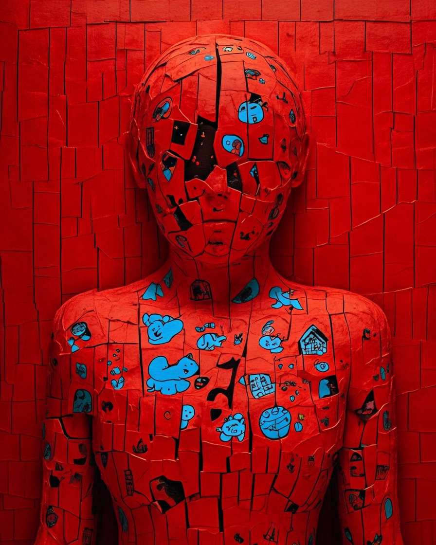 A red, fragmented figure stands covered in blue drawings — animals, faces, houses, abstract symbols. The cracked surface becomes a map of stories, where each segment holds a small piece of memory. The contrast between the rigid red shell and the lively blue markings suggests an identity built from many inner voices.