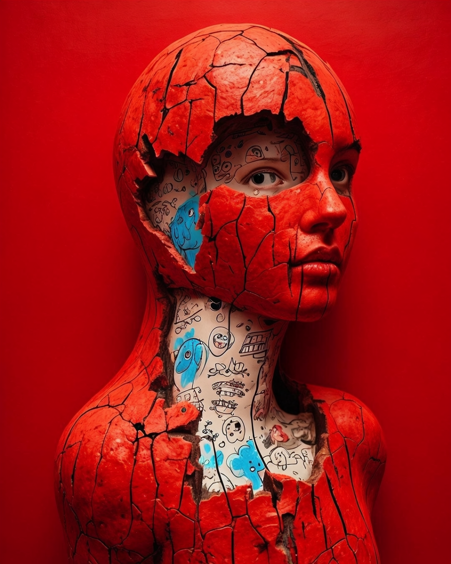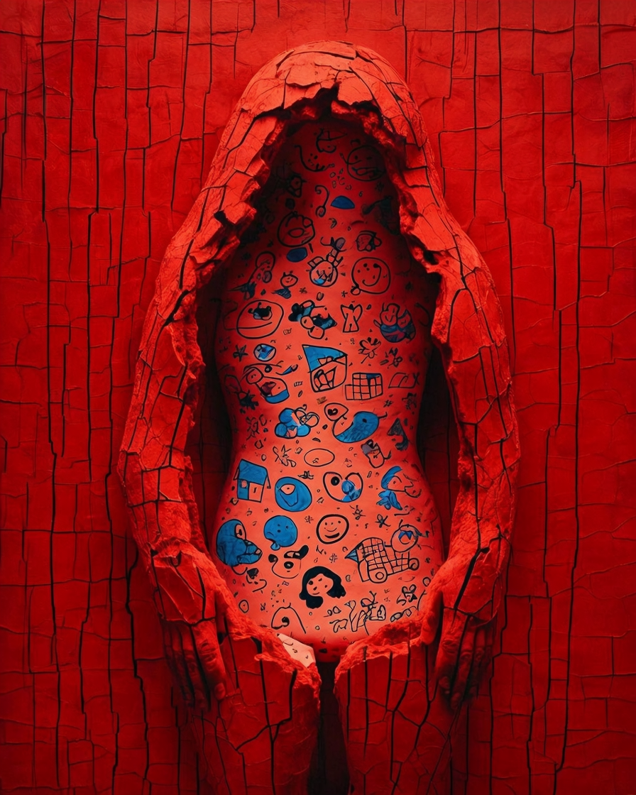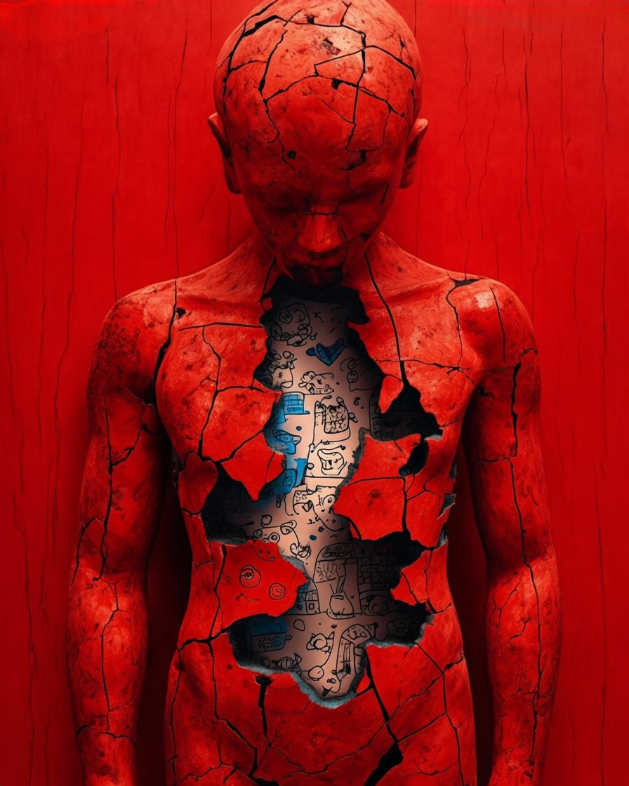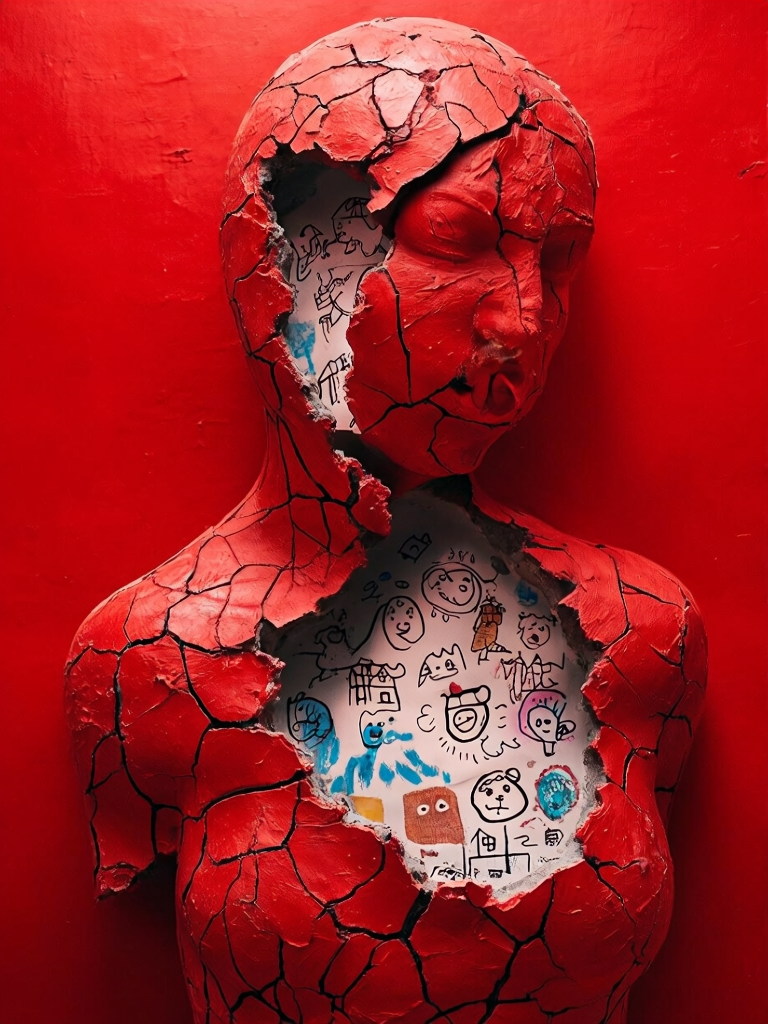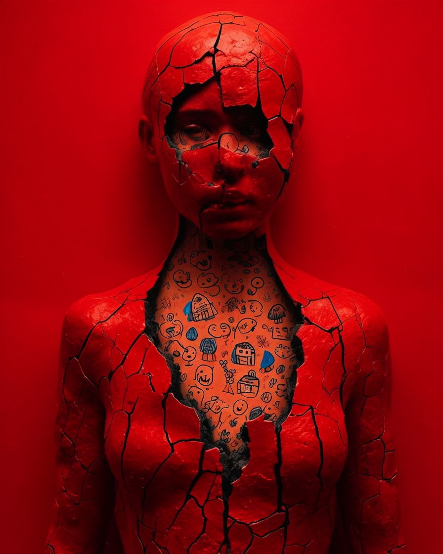 A red, ceramic‑like shell breaks open across the torso, exposing an inner layer filled with black‑ink drawings on pale blue. Faces, animals, and abstract forms emerge like memories surfacing through cracks. The contrast between the rigid exterior and the playful, almost subconscious interior creates a quiet tension, suggesting a self that holds more than it shows.