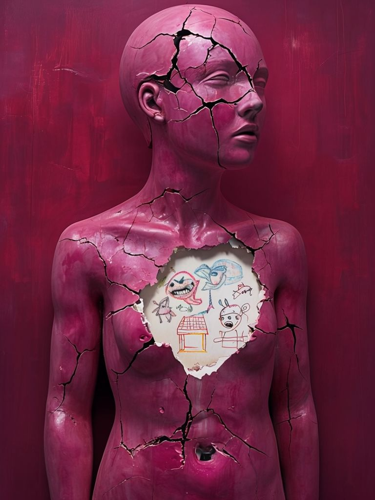 A cracked pink figure reveals a hollow chest filled with childlike drawings — small characters, a house, scattered symbols. The fragile exterior contrasts with an interior that feels alive and restless, as if memories and emotions continue to echo inside the body long after the surface has hardened.