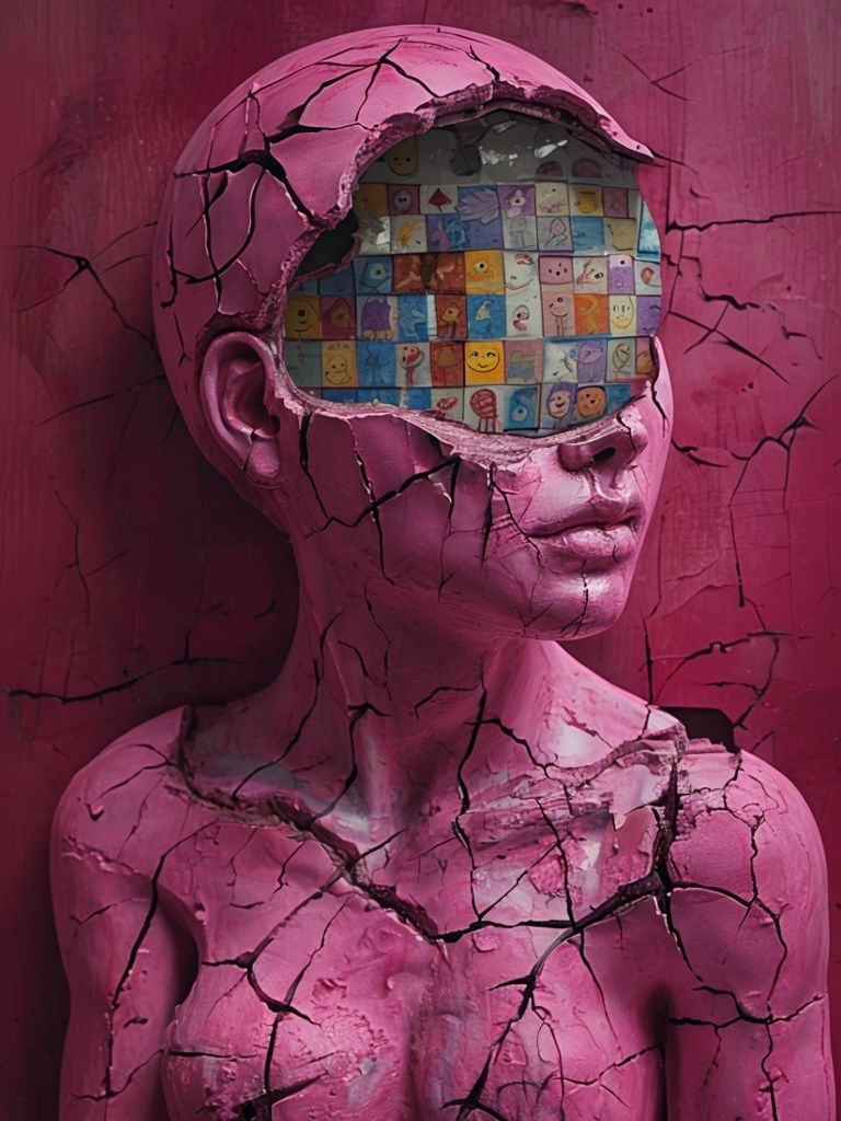 A fractured pink figure stands with a hollowed head, revealing a grid of colorful faces and symbols. The interior forms a mosaic of emotions and identities, contrasting with the cracked, silent exterior. The work suggests a mind composed of many selves, each fragment carrying its own story.
