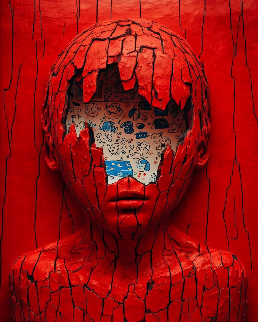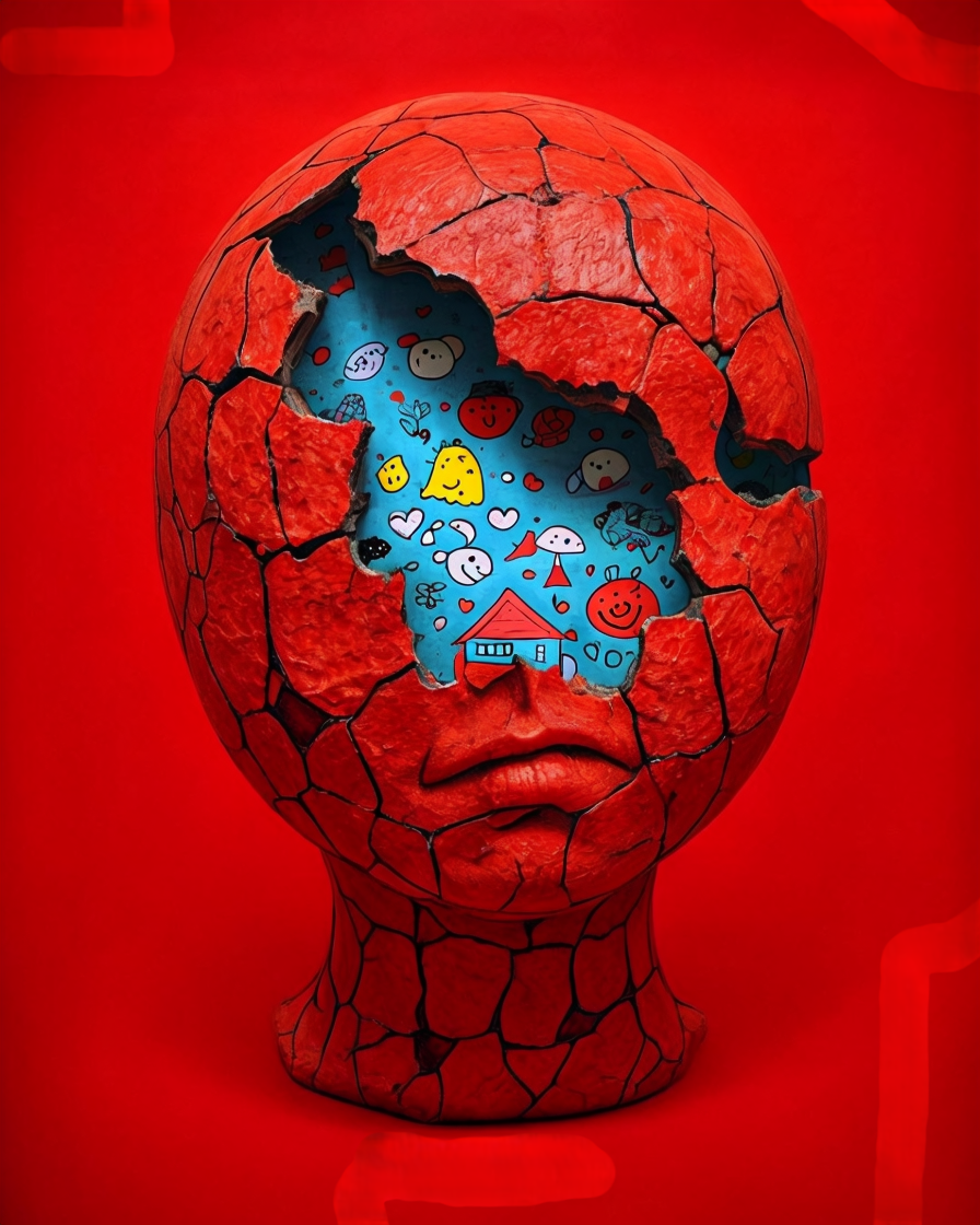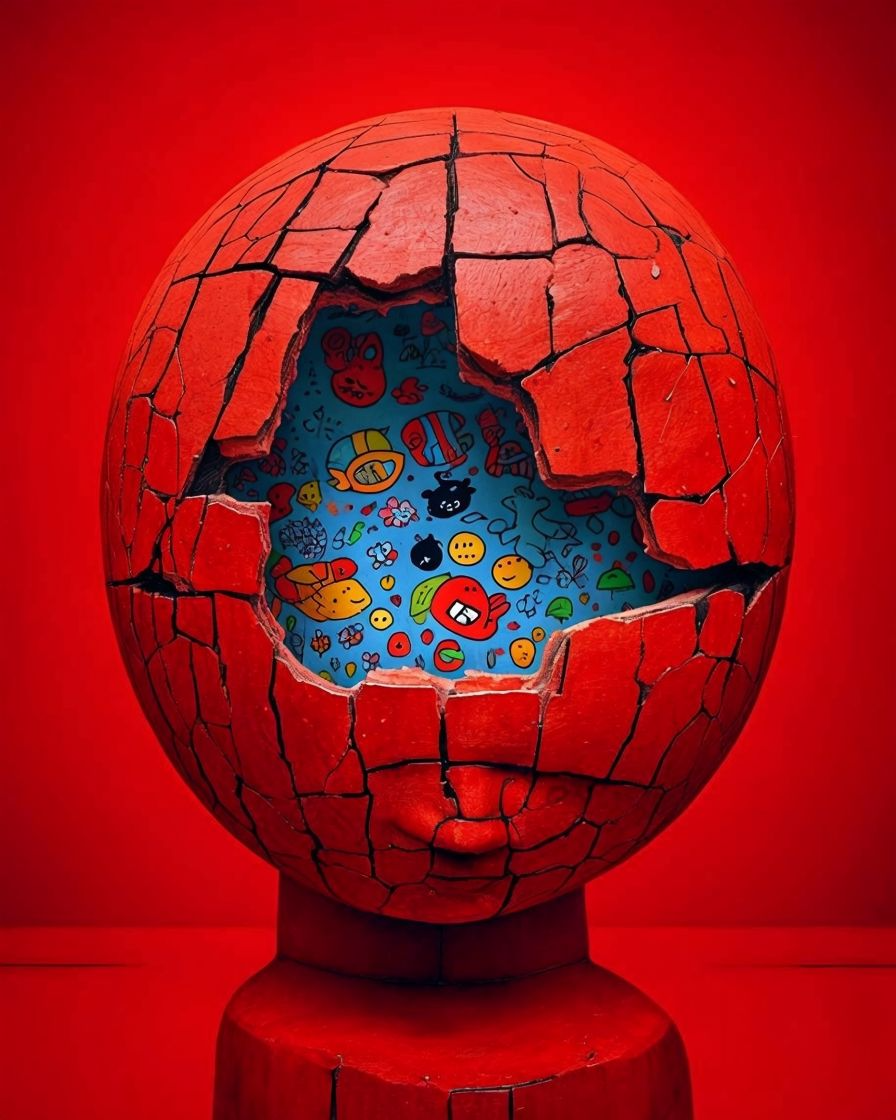 A fractured red head opens to reveal an inner layer filled with playful drawings — abstract faces, symbols, geometric forms. The contrast between the cracked exterior and the expressive interior suggests a mind shaped by hidden stories, where imagination survives beneath the surface.