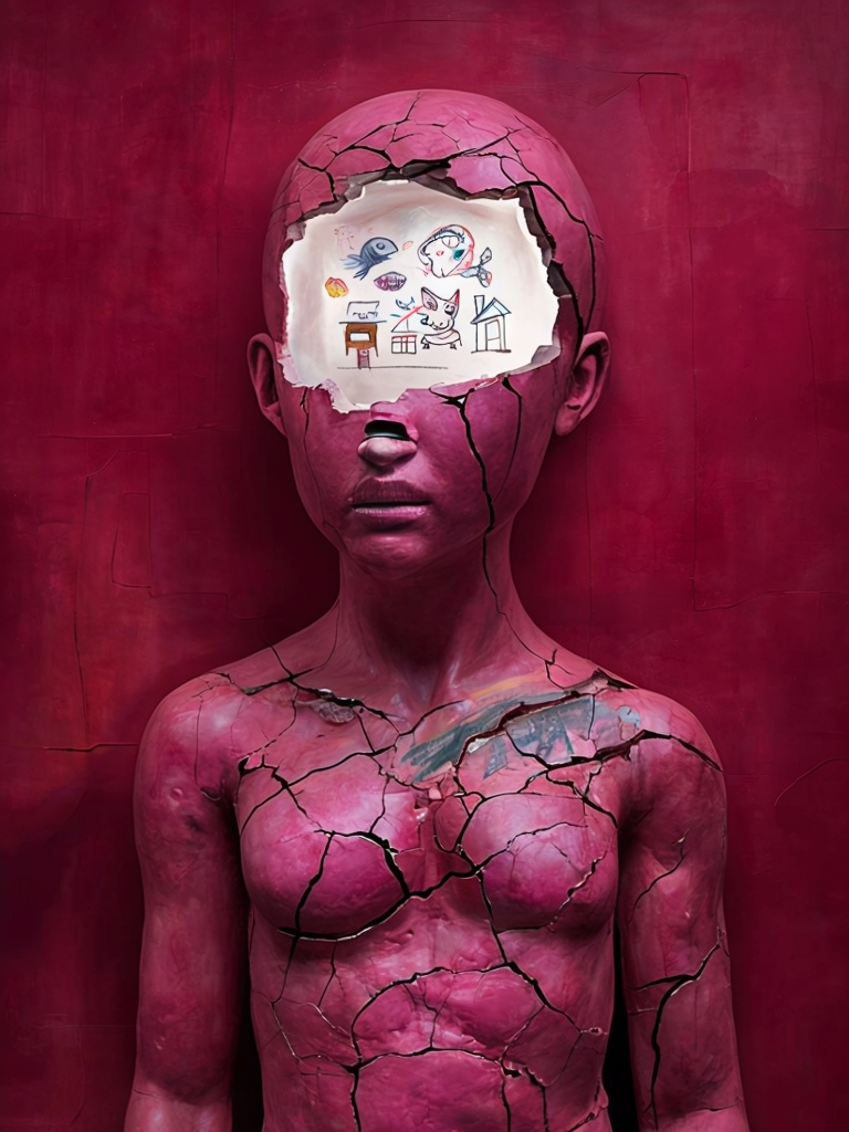 A fractured pink surface splits open at the head, revealing a bright inner space filled with childlike drawings — animals, objects, small figures, fragments of memory. The contrast between the cracked exterior and the playful interior suggests a mind that refuses to hide its imagination, allowing thoughts and memories to spill into the world.