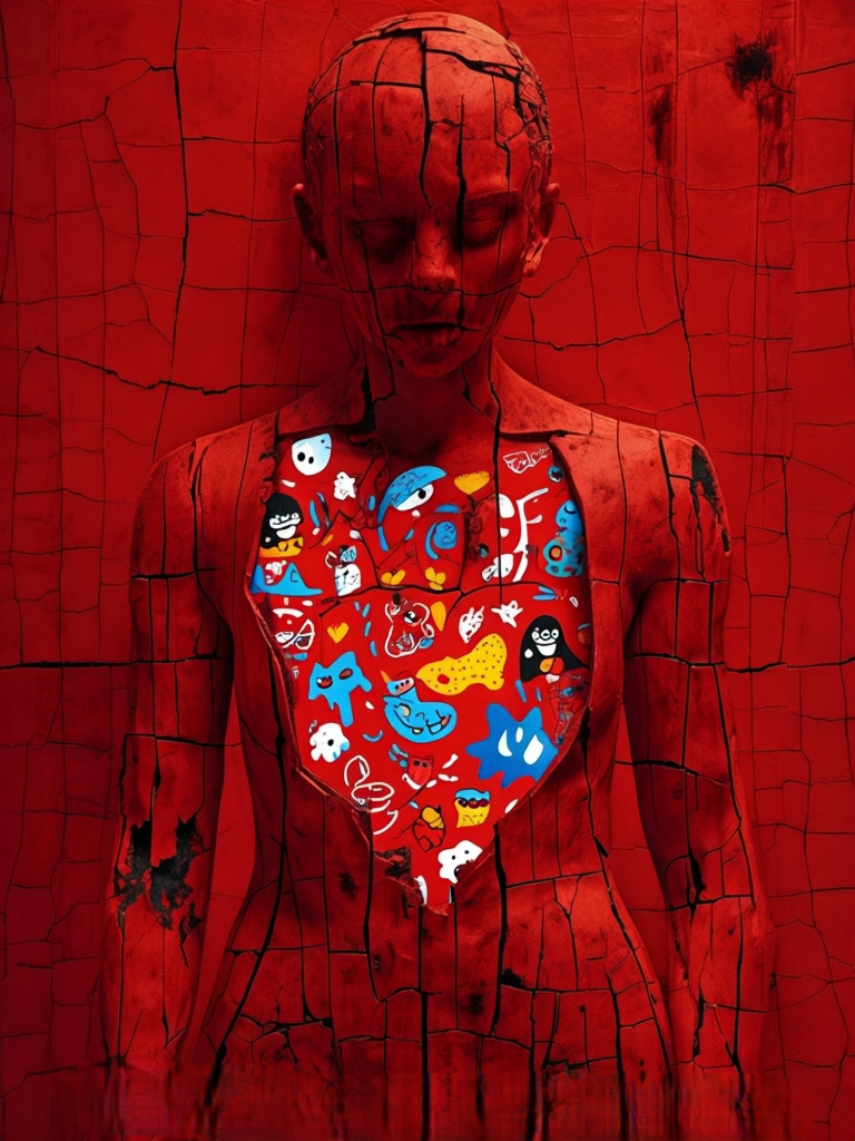 A cracked red bust opens at the chest, revealing a vibrant interior filled with playful drawings — faces, animals, abstract shapes. The contrast between the rigid, broken exterior and the expressive inner world suggests a body that protects itself while still allowing its emotional core to shine through.