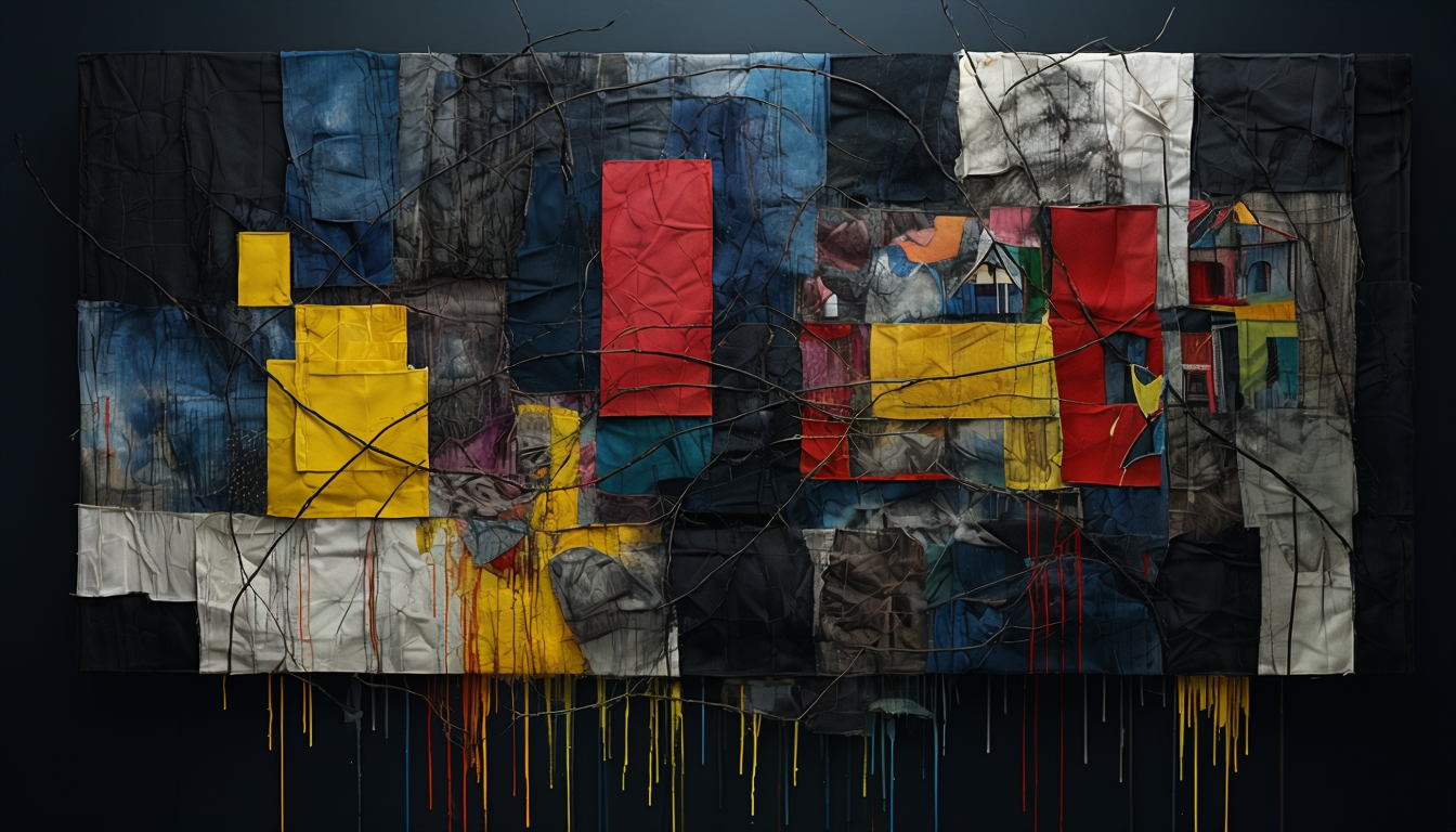 Textile modules and natural elements unfold within an unstable grid, where colour, material and gesture intersect. The work explores the tension between structure and organic presence, revealing a vibrant field of fragmentation and flow.