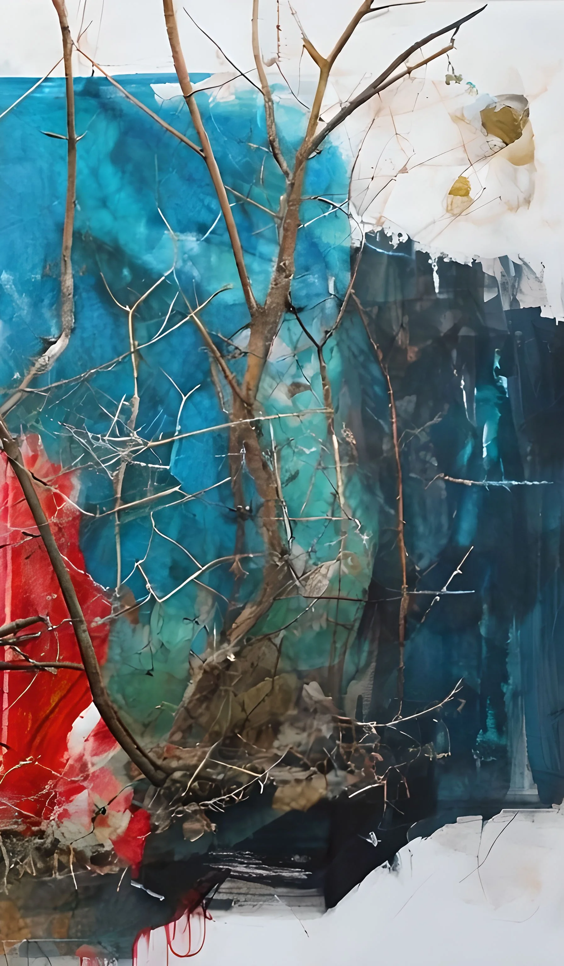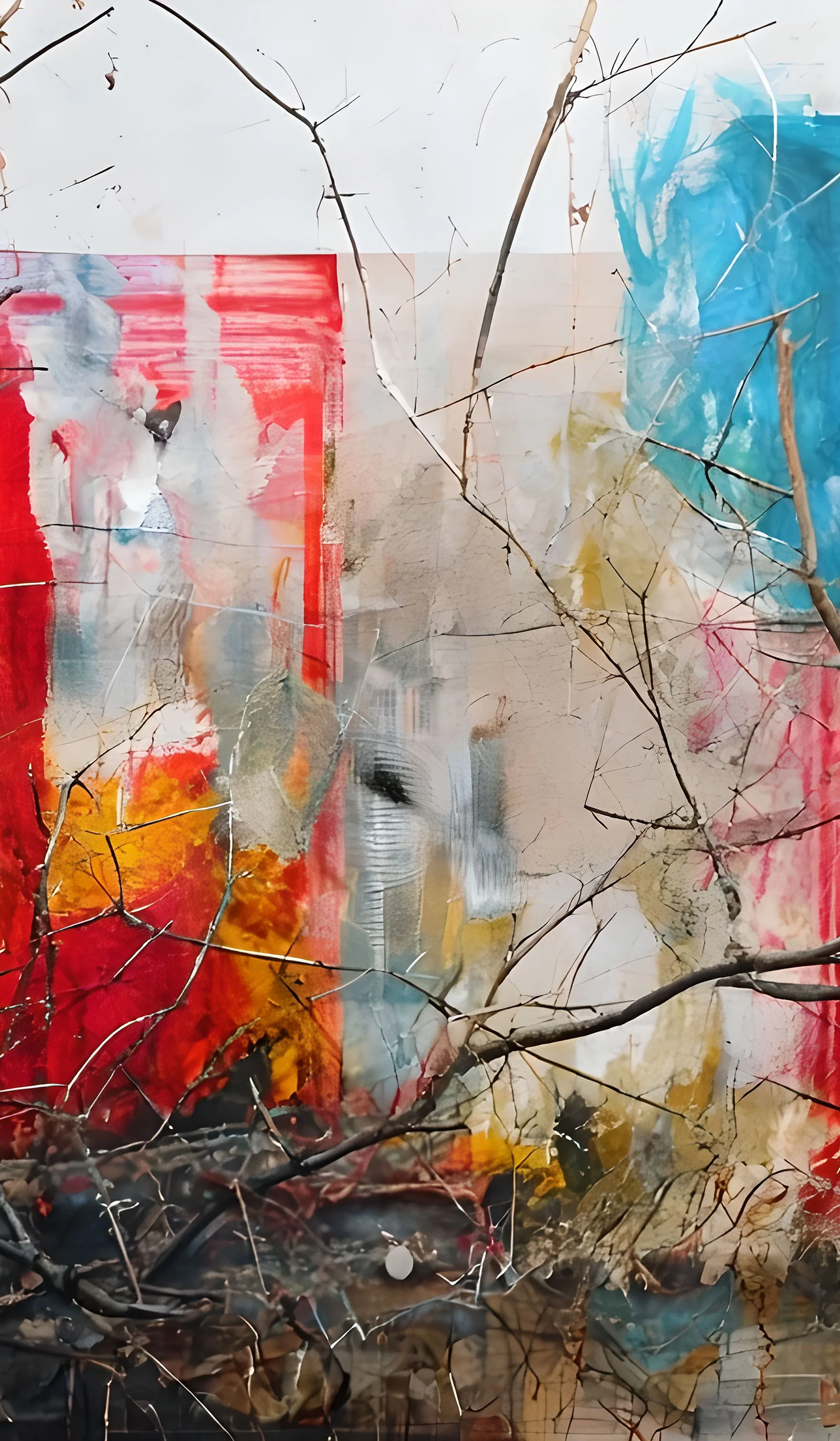 Tensed branches cut through the chromatic field, opening a fracture between gesture and material. The composition asserts an upward movement, where nature appears as both structure and disruption.