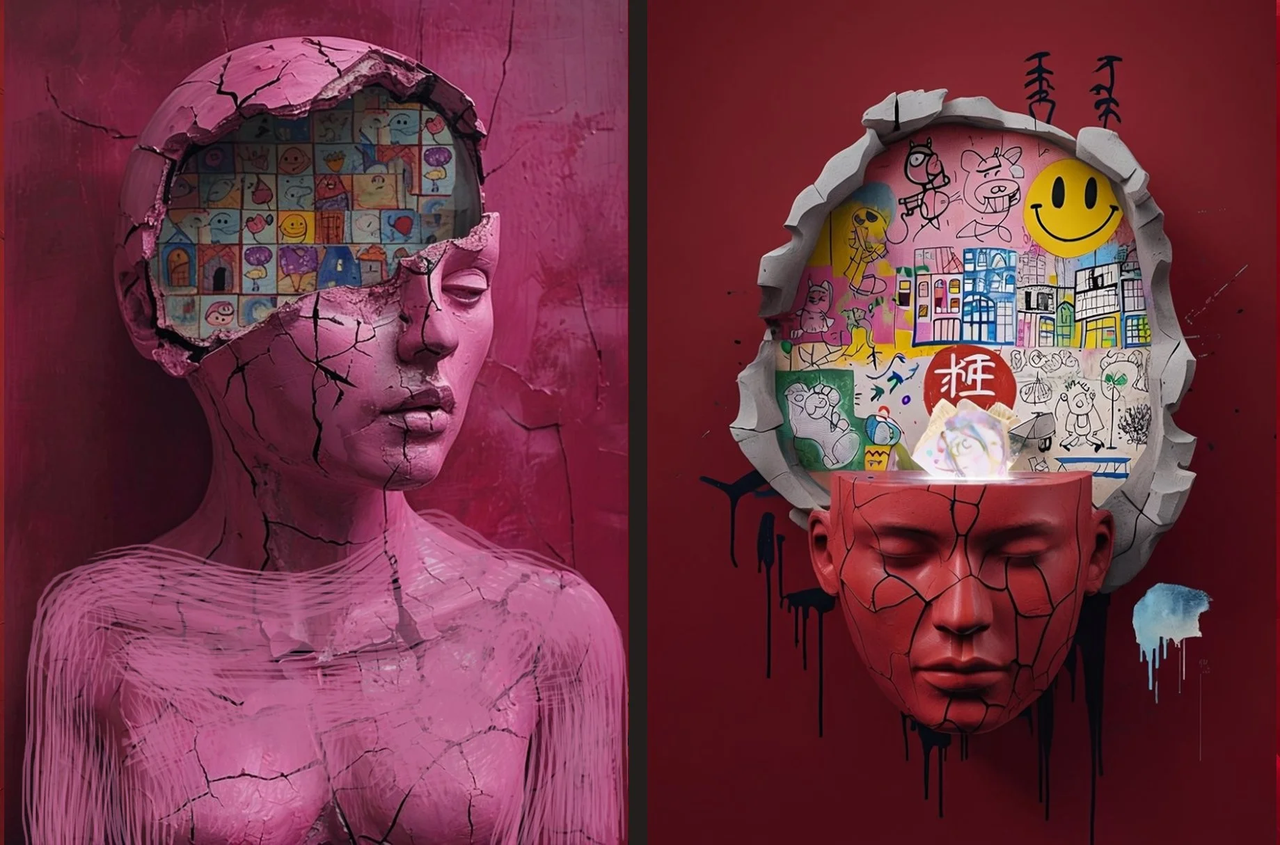 The left panel bursts with graffiti‑like energy, a collision of symbols that feel both personal and collective.